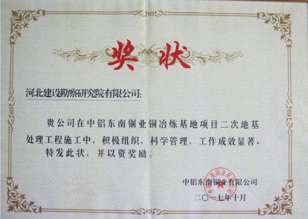 公司承接的福建省寧德市中鋁東南銅業(yè)銅冶煉基地項(xiàng)目二次地基處理工程,施工中嚴(yán)格執(zhí)行公司規(guī)章制度及綜合管理體系標(biāo)準(zhǔn),精心策劃,嚴(yán)格控制,科學(xué)管理。在現(xiàn)場10多家施工單位各項(xiàng)檢查評比中,得到了業(yè)主中鋁東南銅業(yè)有限公司的表揚(yáng),對現(xiàn)場安全、質(zhì)量、進(jìn)度管理給予了高度評價(jià),分別授予“項(xiàng)目管理突出”獎和“質(zhì)量管理”獎。