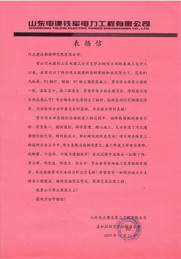 近日,由我公司承建的孟加拉艾薩拉姆項(xiàng)目樁基工程收到總包單位山東電建三公司的表?yè)P(yáng)信,經(jīng)過(guò)項(xiàng)目部全體員工的辛勤付出,得到總包單位的高度認(rèn)可,為后續(xù)雙方合作奠定良好基礎(chǔ)。這充分彰顯了河北建勘人的風(fēng)采,充分體現(xiàn)了河北建勘人的鐵軍精神,充分展示了河北建勘的戰(zhàn)斗力和實(shí)力,為我司業(yè)務(wù)在孟加拉更好更快發(fā)展提供了保證。項(xiàng)目部全體員工一定會(huì)珍惜榮譽(yù),珍視公司良好發(fā)展平臺(tái),再接再厲,圓滿(mǎn)完成后續(xù)施工任務(wù)!