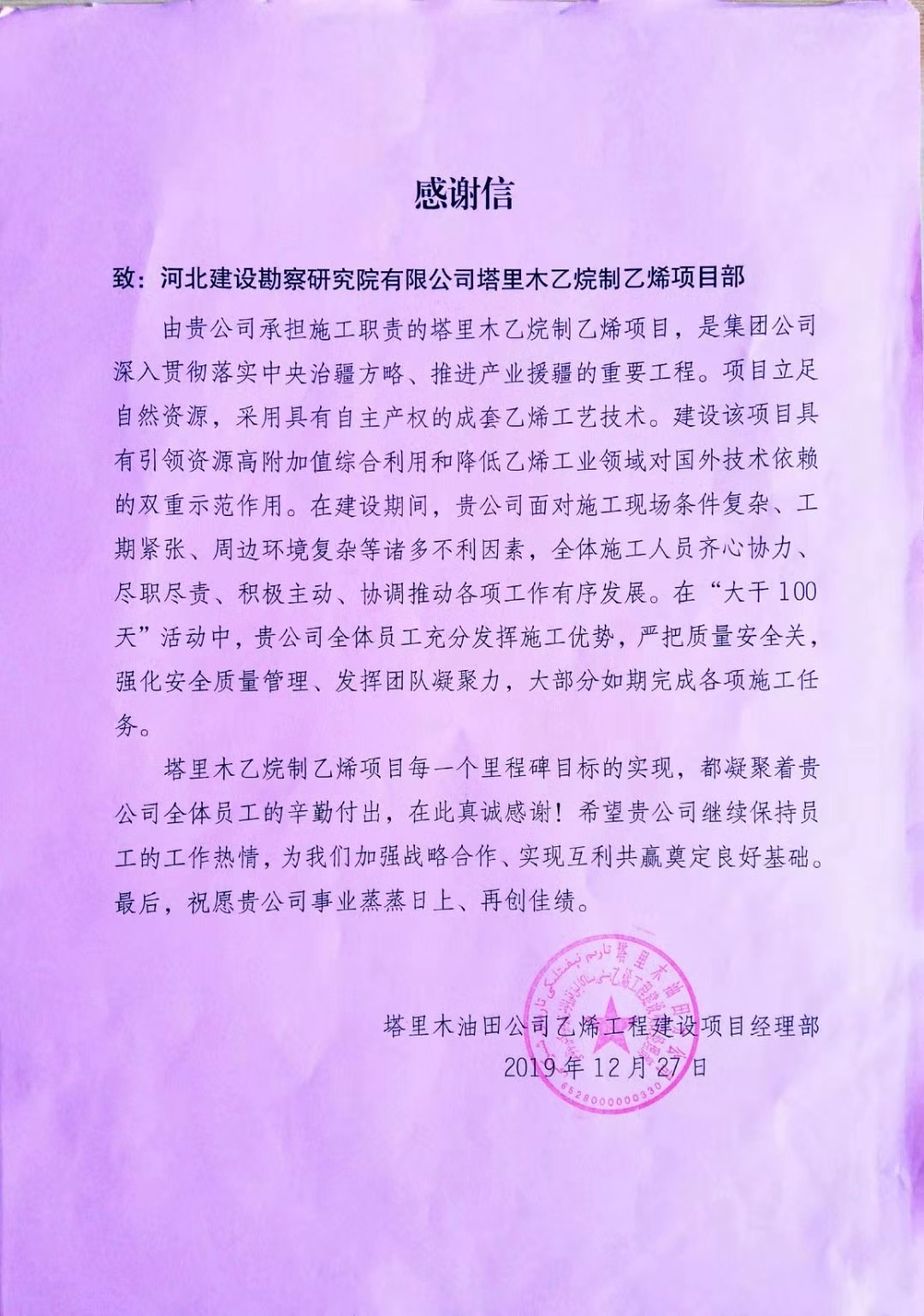 公司近日收到業(yè)主塔里木油田公司乙烯工程建設(shè)項目經(jīng)理部的感謝信及中國寰球工程有限公司北京分公司的質(zhì)量管理先進集體錦旗。在建設(shè)期間,我公司面對現(xiàn)場條件復(fù)雜、工期緊張等諸多不利因素,全體施工人員齊心協(xié)力、盡職盡責(zé)、積極主動、協(xié)調(diào)推動各工作有序開展,在施工中,嚴把質(zhì)量安全觀、強化安全質(zhì)量管理、發(fā)揮團隊凝聚力,很好的完成了各項施工任務(wù),為雙方進一步加強戰(zhàn)略合作、實現(xiàn)互利共贏奠定了良好基礎(chǔ)。