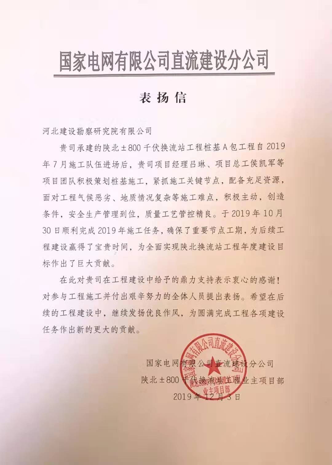 另有陜北換流站項目部也收到國家電網(wǎng)直流建設(shè)分公司的感謝信,該項目自2019年7月進場后,在項目經(jīng)理呂琳、項目總工侯凱軍等精心組織和艱苦努力下,順利完成施工任務(wù),確保了重要節(jié)點工期,為后續(xù)工程建設(shè)贏得了寶貴時間,為全面實現(xiàn)陜北換流站工程年度建設(shè)目標作出巨大貢獻,受到業(yè)主的充分肯定和高度表揚。