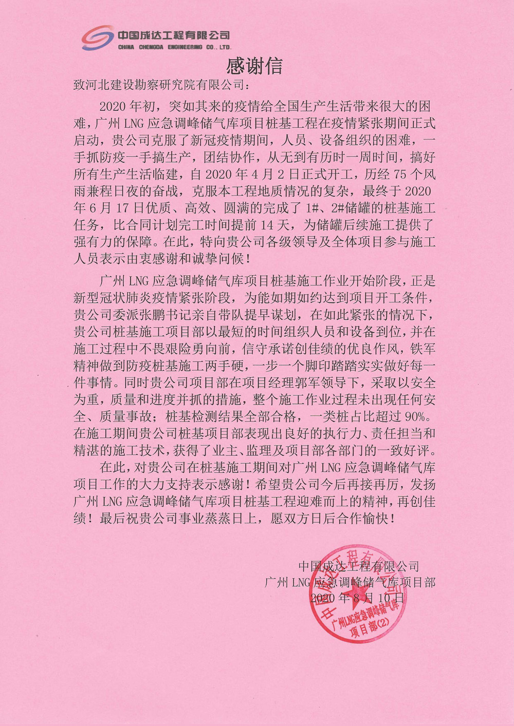 近日,我公司廣州LNG應急調峰儲氣庫項目收到成達公司發放的感謝信。廣州LNG應急調峰項目是我公司首次在LNG行業打入廣州市場,也是首次和中國成達工程公司進行合作,項目部全體員工發揚公司的鐵軍精神做到防疫施工兩手硬,不畏艱險勇向前,齊心協力、積極策劃,圓滿的完成了各項任務,為廣州LNG應急調峰項目順利實施打下良好的基礎;在施工中,項目安全生產管理到位,質量工藝管控優良,贏得了業主、監理及相關各方高度認可。對全體參建本項目的領導與員工表示了衷心的感謝,并希望在后續的工程建設中,繼續發揚河北建勘的優良工作作風!