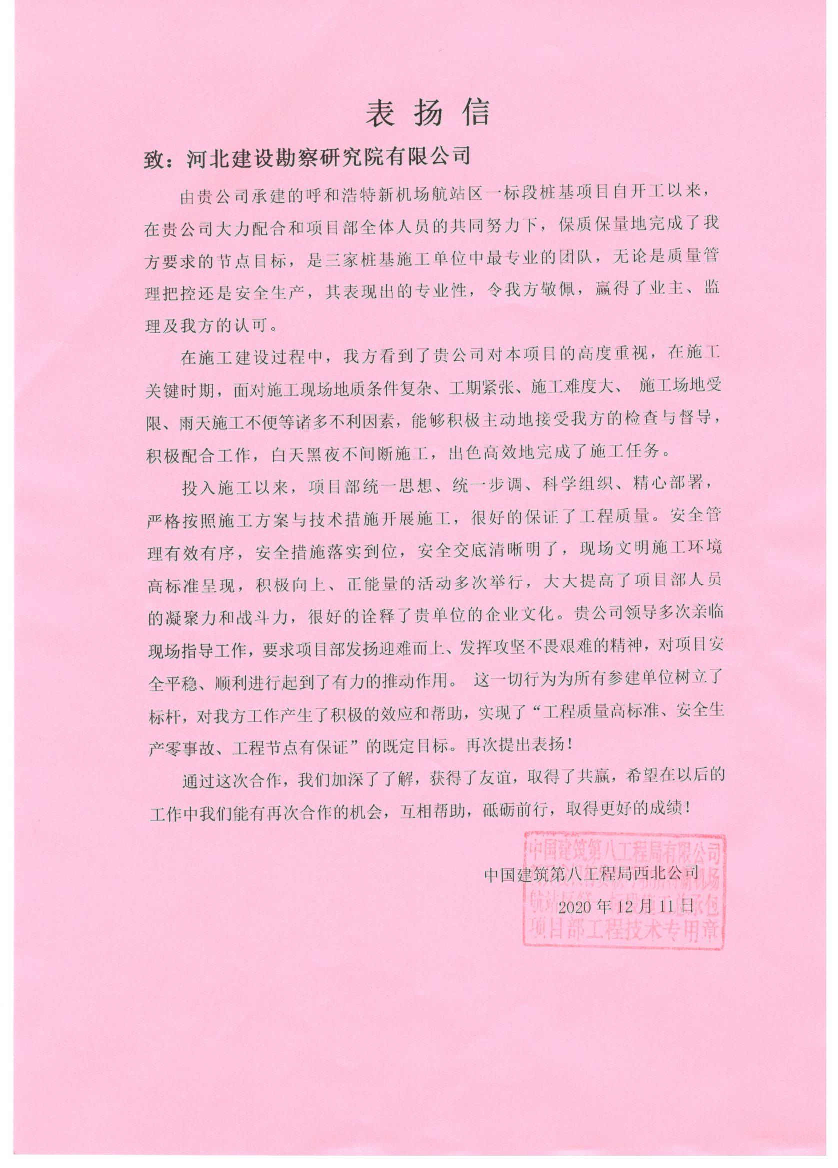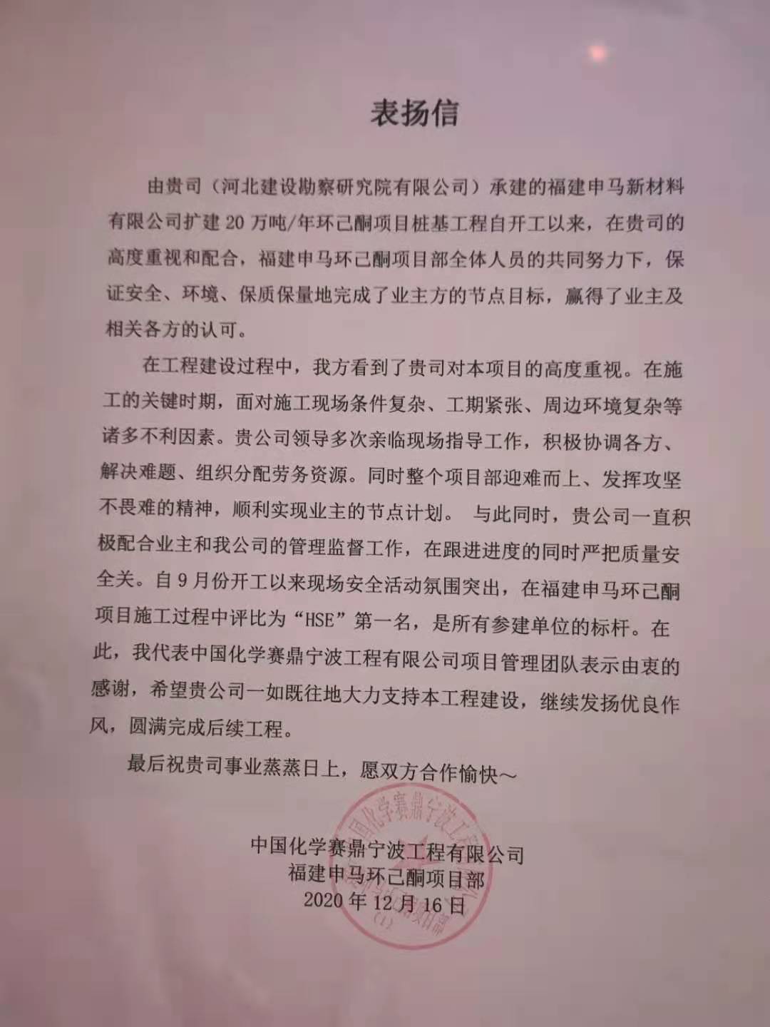 近日,公司收到中國化學賽鼎寧波工程有限公司福建申馬環己酮項目部、中國建筑第八工程局西北公司呼和浩特新機場航站區一標段樁基項目部的表揚信。