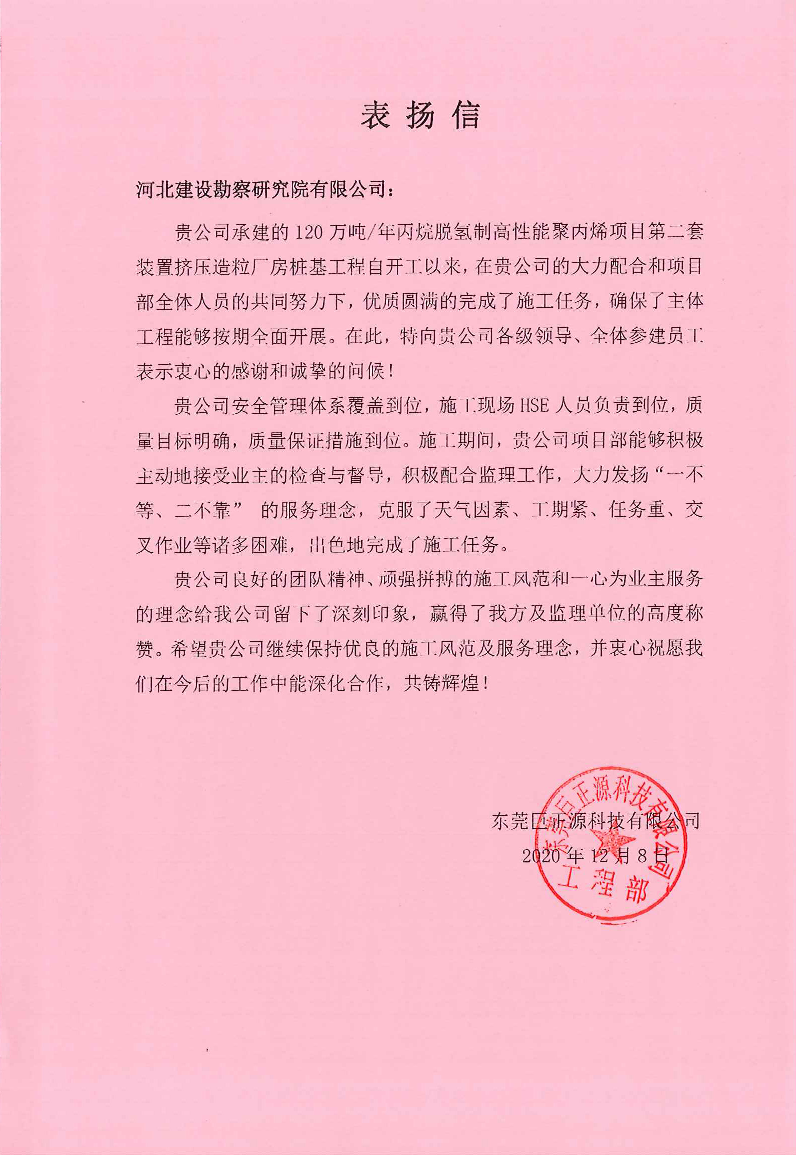 東莞巨正源120萬噸/年丙烷脫氫制高性能聚丙烯項目第二套裝置擠壓造粒廠房樁基工程自開工以來,安全管理體系覆蓋和質量保證措施到位,大力發揚“一不等、二不靠”的服務理念,克服了工期緊、任務重、交叉作業等諸多困難,出色地完成了施工任務。特向公司各級領導、全體參建員工表示衷心的感謝和誠摯的問候!