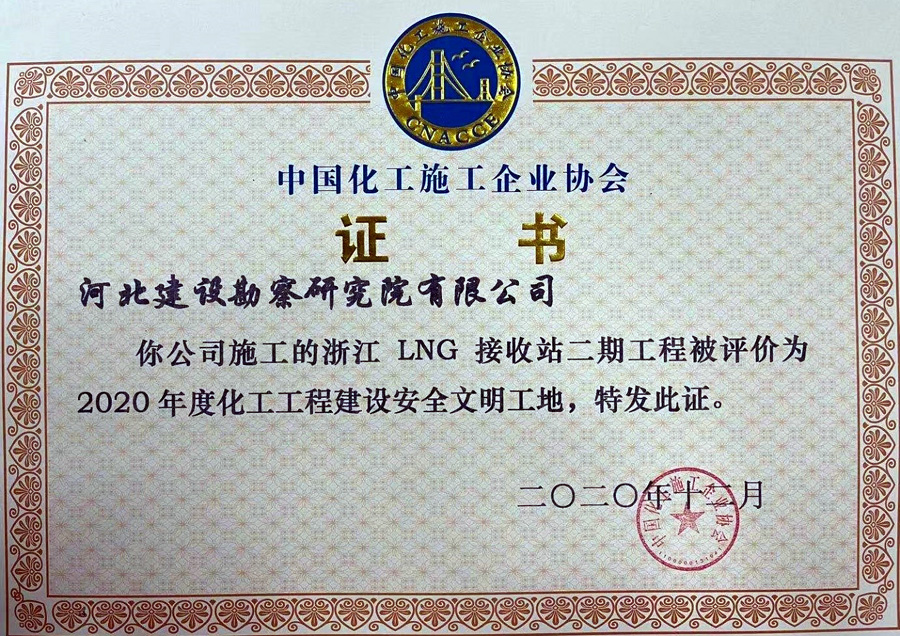 公司浙江LNG項(xiàng)目被中國化工施工企業(yè)協(xié)會評為2020年度化工工程建設(shè)安全文明工地
