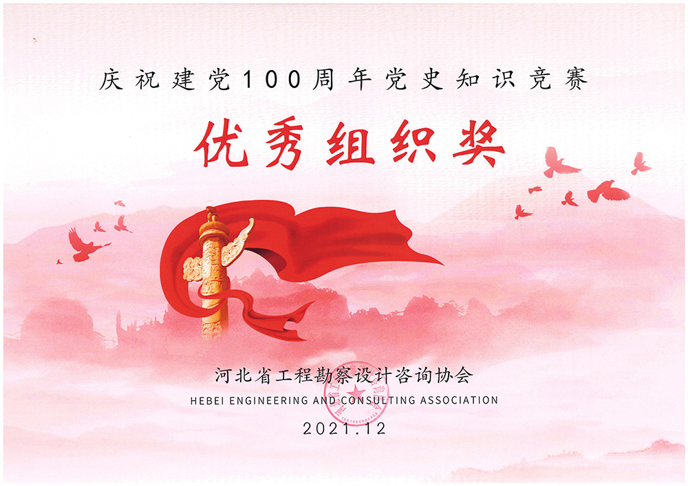 2021年,為隆重慶祝中國共產(chǎn)黨成立 100 周年,號召廣大黨員群眾進一步了解黨的百年奮斗史,以史為鑒,砥礪前行,為行業(yè)高質(zhì)量發(fā)展作出積極貢獻,河北省工程勘察設計咨詢協(xié)會主辦了以“重溫黨史,不忘初心”為主題的黨史知識學習競賽活動。公司黨委組織公司廣大黨員群眾積極踴躍參加,并取得較好學習效果。近日,被河北省工程勘察設計咨詢協(xié)會授予“優(yōu)秀組織獎”。