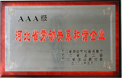 3月28日在河北會堂召開的“河北省創建勞動關系和諧企業表彰會”上,我公司被授于“河北省AAA級勞動關系和諧企業”。省委常委、省總工會主席藏勝業同志向公司董事長韓立君同志頒發了獎牌。