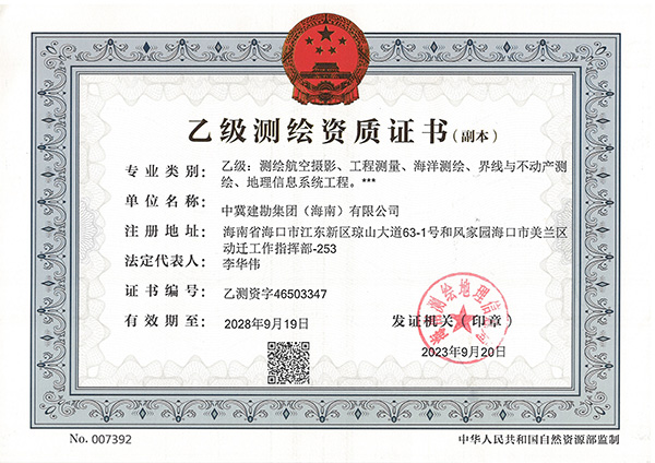 在集團(tuán)公司領(lǐng)導(dǎo)的正確領(lǐng)導(dǎo)下,經(jīng)過工程測量公司和安全生產(chǎn)部的精心運作,中冀建勘集團(tuán)(海南)有限公司于2023年9月20日取得了海南測繪地理信息局頒發(fā)的測繪乙級資質(zhì),資質(zhì)包含五個專業(yè):測繪航空攝影、工程測量、海洋測繪、界線與不動產(chǎn)測繪、地理信息系統(tǒng)工程。