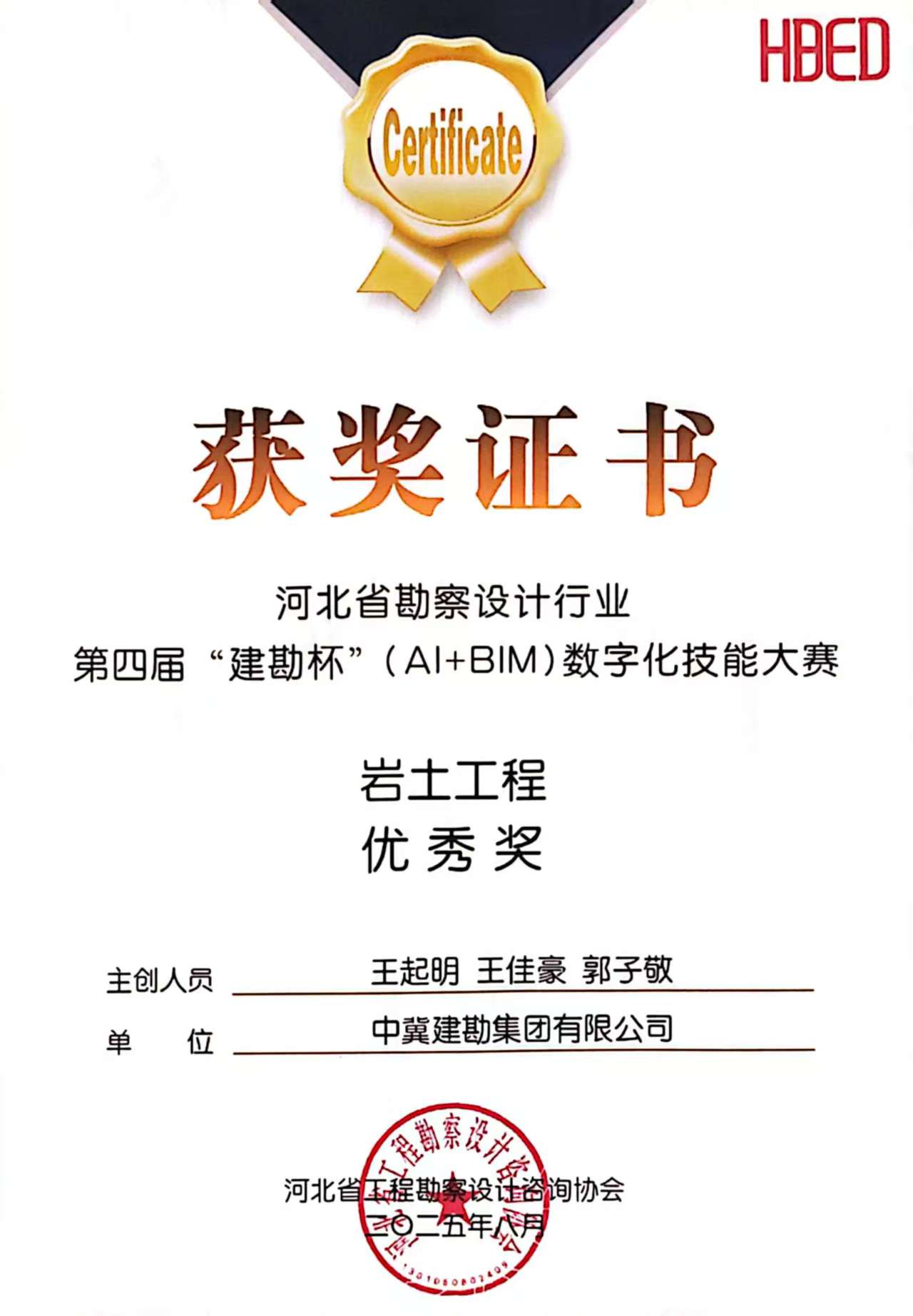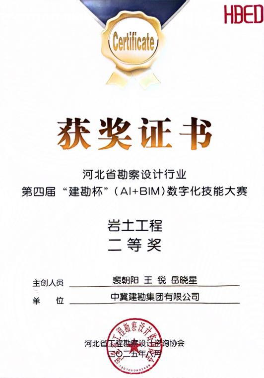 近日,河北省工程勘察設計咨詢協會主辦的第四屆“建勘杯”(AI+BIM)數字化技能大賽舉行了頒獎儀式。集團公司參賽的兩個項目分別榮獲二等獎和優秀獎。