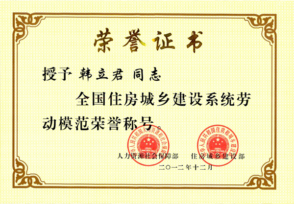 為進一步激勵全國住房城鄉(xiāng)建設(shè)系統(tǒng)廣大干部職工的積極性、主動性、創(chuàng)造性,促進住房城鄉(xiāng)建設(shè)事業(yè)健康持續(xù)發(fā)展,人力資源和社會保障部、住房和城鄉(xiāng)建設(shè)部在全國住房城鄉(xiāng)建設(shè)系統(tǒng)內(nèi),開展了先進集體和先進個人的評選活動。經(jīng)過公司及各級人力資源社會保障部門、住房城鄉(xiāng)建設(shè)管理部門的逐級推薦,報評選表彰工作領(lǐng)導小組審查通過后,最后由住房城鄉(xiāng)建設(shè)部黨組和人力資源社會保障部審定,評選出先進集體200個,先進工作者450名,勞動模范350名。其中,我公司董事長韓立君同志榮獲全國住房城鄉(xiāng)建設(shè)系統(tǒng)勞動模范稱號。